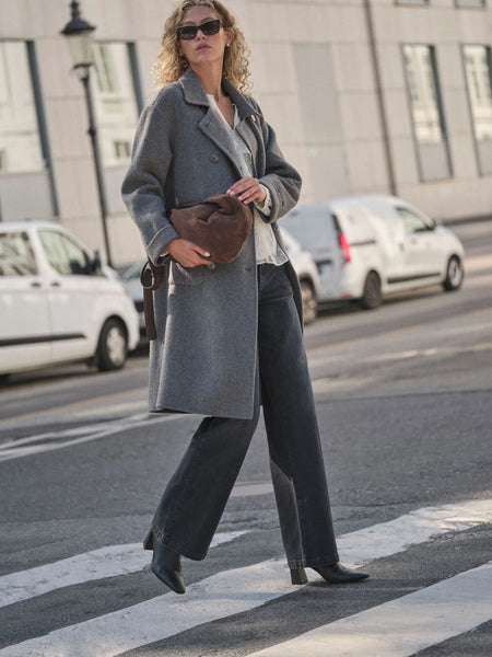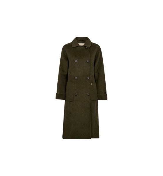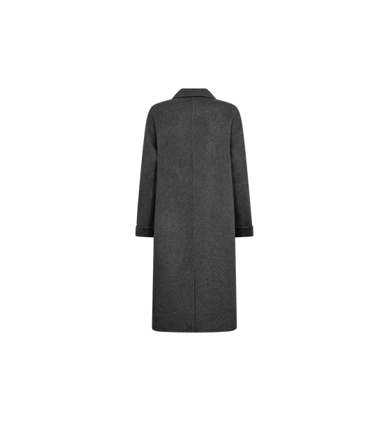 Mos Mosh pitkä villakangastakki on suunniteltu käsintehdyn näköiseksi ja vuorittomaksi. Sen saumat on viimeistelty huolellisesti käsin yhdistäen saumattomasti kaksi kangasta ylellisen tuntuman saavuttamiseksi. Klassinen kaulus ja napitus viimeistelevät takin.